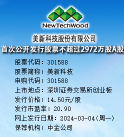中国上市公司网讯 3月4日,美新科技股份有限公司(以下简称“美新科技”或公司)申购。公司的股票简称为“美新科技”,股票代码为“301588”,该代码同时适用于本次发行的初步询价、网下申购及网上申购。美新科技本次发行价格为14.50元/股,发行市盈率为20.90倍。