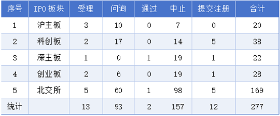 截至10月12日,IPO排队企业277家,其中沪主板排队企业20家,科创板排队企业38家,深主板排队企业22家,创业板排队企业28家,北交所排队企业169家。