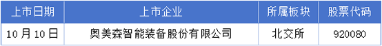 10月9日至10月12日期间,奥美森智能装备股份有限公司挂牌上市。