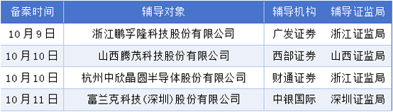 10月9日至10月12日期间新增辅导备案企业4家,分别为浙江鹏孚隆科技股份有限公司、山西腾茂科技股份有限公司、杭州中欣晶圆半导体股份有限公司、富兰克科技(深圳)股份有限公司