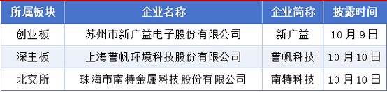 10月9日至10月12日期间,苏州市新广益电子股份有限公司、上海誉帆环境科技股份有限公司、珠海市南特金属科技股份有限公司取得了注册批文。