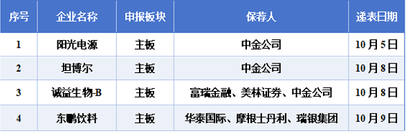 10月5日至10月11日期间阳光电源、坦博尔、诚益生物-B、东鹏饮料向港交所递交上市申请,其中阳光电源、东鹏饮料已登陆A股,此次冲击“A+H”两地上市。