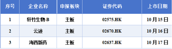10月5日至10月11日期间,轩竹生物-B、云迹、海西新药3家企业启动招股,其中轩竹生物-B招股已经结束。