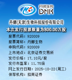 中国上市公司网讯 10月22日,丹娜(天津)生物科技股份有限公司(以下简称“丹娜生物”或公司)申购。公司的股票简称为“丹娜生物”,证券代码为“920009”。丹娜生物本次发行价格为17.10元/股,发行市盈率为11.75倍。