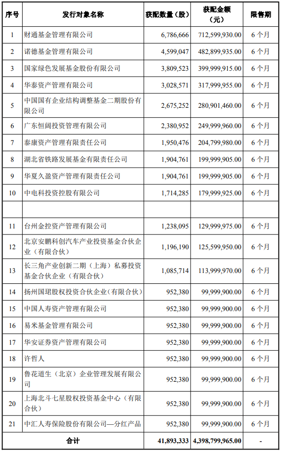 据公开资料显示,德赛西威本次发行对象确定为21家,发行对象认购的本次发行的股票自发行结束之日起6个月内不得转让。公司本次发行募集资金总额4,398,799,965.00元,募集资金净额为4,393,133,743.62元。