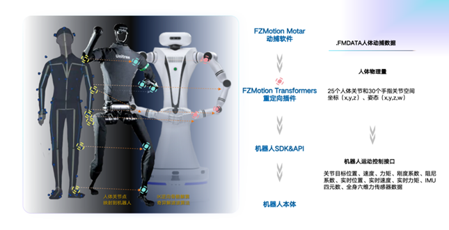 作为机器人训练系统的核心基座,FZMotion以亚毫米级精度捕捉人体和机器人的运动轨迹,采用动捕技术精准采集人体长序列复杂动作,将人体骨骼和关节运动位姿映射到机器人URDF模型,经过深度学习算法优化机器人运动轨迹和关节角度解算,采用模仿学习引导+强化学习框架训练运动小脑,突破长序列动作的泛化性限制,仿真训练结合监督微调,让机器人站稳不摔跤,动作更类人,再部署到真机验证,赋予机器人快速学习与精准复现人类复杂动作的能力,实现更自然灵巧的人机协作,为人机自然交互、高效协作树立全新标杆。