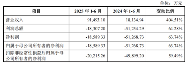 2022年至2025年6月,公司营业收入分别为42.64万元、5302.12万元、74307.16万元和91493.10万元,归属于母公司所有者的净利润分别为-77696.52万元、-87115.82万元、-140887.94万元和-18589.33万元。2025年上半年归母净亏损同比收窄63.74%,展现出显著的亏损收窄趋势。