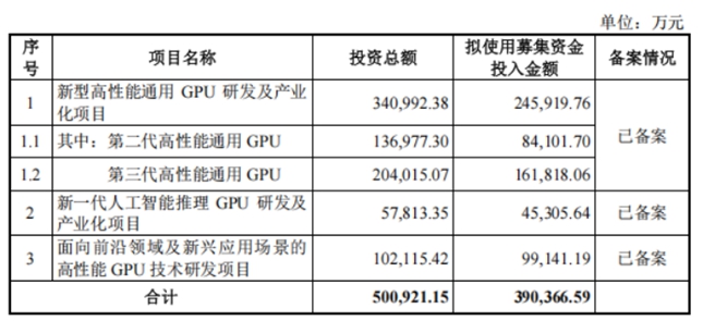 本次发行计划募集资金39.04亿元,拟投向资“新型高性能通用GPU研发及产业化项目”、“新一代人工智能推理GPU研发及产业化项目”和“面向前沿领域及新兴应用场景的高性能GPU技术研发项目”。