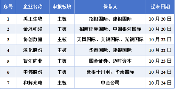 10月19日至10月25日期间禹王生物、金添动漫、协创数据、滨化股份、智汇矿业、中伟股份、和辉光电向港交所递交上市申请,其中协创数据、滨化股份、中伟股份、和辉光电已登陆A股,此次冲击“A+H”两地上市。