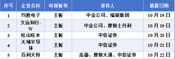 10月19日至10月25日期间,均胜电子、文远知行-W、旺山旺水、天域半导体、百利天恒共5家公司通过聆讯。