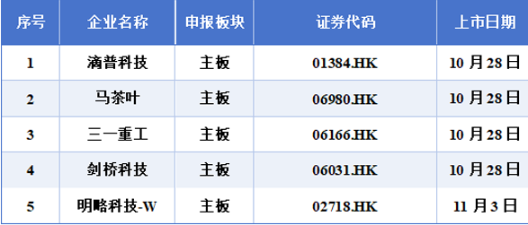 10月19日至10月25日期间,滴普科技、八马茶叶、三一重工、剑桥科技、明略科技-W启动招股程序,其中滴普科技、八马茶叶、三一重工、剑桥科技已于该时段完成招股。
