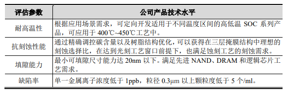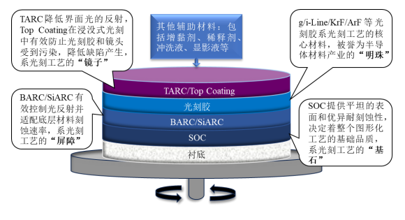 在光刻材料领域,公司已建立完善的产品体系。报告期内,公司已实现SOC、BARC、i-Line光刻胶、KrF光刻胶等产品的量产供货,其中SOC和BARC作为公司自产光刻材料的主力产品,销售收入占比超过90%。这些产品在先进集成电路制造中扮演着不可或缺的角色:SOC作为光刻工艺的”基石”,能够平整衬底表面,为后续材料旋涂提供基础;BARC则能有效消除反射光引起的驻波效应,保障图形转移的精确性。