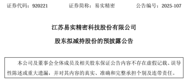 2025年11月7日,易实精密发布了公告,股东徐爱明、张晓、张文进因自身资金需求,计划通过集中竞价或大宗交易方式减持公司股份。其中,徐爱明拟减持不超140万股(占总股本1.2065%),张晓拟减持不超30万股(占0.2585%),张文进拟减持不超60万股(占0.5171%),减持期间为公告披露后15或30个交易日后的3个月内,价格将依据市场情况确定。本次减持不会导致公司控股股东及实际控制人变更,亦不会对生产经营产生不利影响。