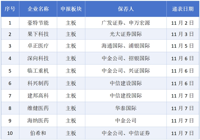 11月2日至11月8日期间豪特节能、果下科技、卓正医疗、深向科技、临工重机、科兴制药、建邦高科、维健医药、海纳医药、伯希和向港交所递交上市申请,其中科兴制药已登陆A股,此次冲击“A+H”两地上市。