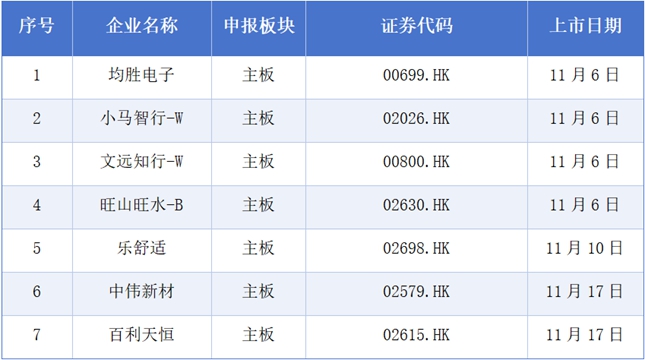 11月2日至11月8日期间,均胜电子、小马智行-W、文远知行-W、旺山旺水-B、乐舒适、中伟新材、百利天恒启动招股程序,其中,均胜电子、小马智行-W、文远知行-W、旺山旺水-B、乐舒适已结束招股。