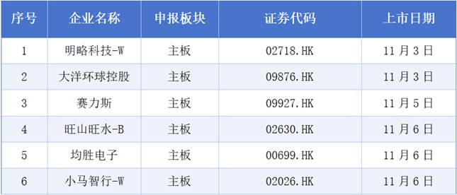 11月2日至11月8日期间,明略科技-W、大洋环球控股、赛力斯、旺山旺水-B、均胜电子、小马智行-W、文远知行-W挂牌上市。