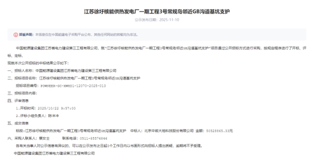 11月10日,从中国能源建设集团江苏省电力建设第三工程有限公司传来喜讯,中岩大地凭借卓越的技术方案和可靠的工程实力,在激烈的公开竞标中脱颖而出,成功中标“江苏徐圩核能供热发电厂一期工程3号常规岛邻近GB沟道基坑支护”项目,中标金额高达5052.89万元。这一重要中标,不仅是市场对中岩大地专业技术水平的高度认可,更是公司在核能建设这一高端领域深厚积淀与品牌影响力的有力体现,为公司的业绩增长注入了新的强劲动力。