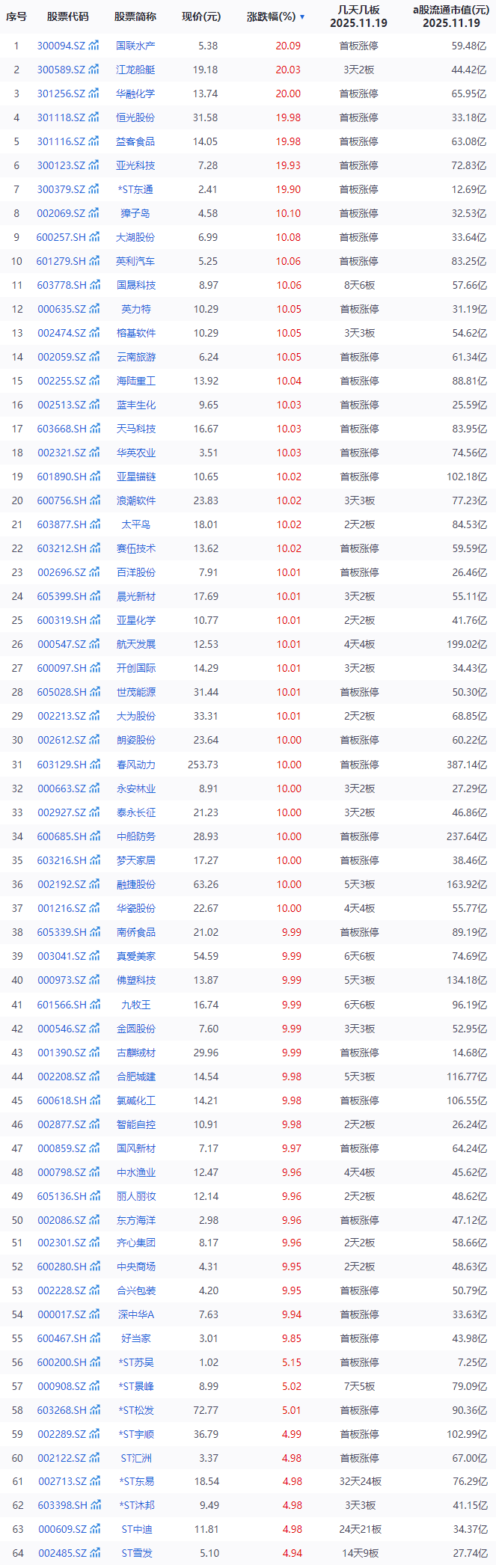 盘面上,军工装备板块走强,亚星锚链涨停封板,江龙船艇涨超10%。保险板块全线走高,中国人保涨近3%,中国太保涨超2%。锂板块冲高震荡,融捷股份、永杉锂业触及涨停。水产板块全线走强,国联水产、獐子岛、大湖股份、好当家涨停封板。海南板块全线调整,海南海药、海马汽车触及跌停。燃气板块弱势,胜利股份触及跌停,长春燃气跌超7%。