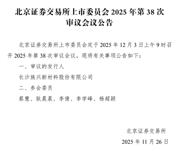 根据北交所上市委2025年11月26日公告,长沙族兴新材料股份有限公司(简称“族兴新材”)将于12月3日迎来上市委审议会议。作为国家级专精特新“小巨人”重点企业,族兴新材凭借在铝颜…