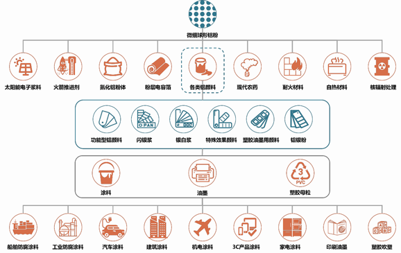 公司的铝颜料以微细球形铝粉为原料,经过研磨、精密分级、均匀混合、分散、包覆复合、改性、固液分离、干燥、抛光等工艺制得片状铝粒子,对光和热的反射性能良好,主要用于涂料、印刷油墨和塑胶等产品。铝颜料质轻,能反射可见光,具有明亮的金属光泽、良好的遮盖力以及随角异色效应,使其具备独特的颜色效果。同时,因可反射红外光和紫外光,还具有保温性能和延缓涂层老化的保护作用,是珠光颜料、有机颜料及其他金属颜料无法取代的产品。经过多年发展,公司已成功开发和生产了数千种型号的铝颜料产品,能够满足不同客户对不同效果和性能的个性化产品需求。