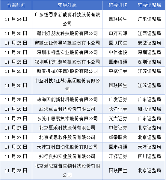 11月24日至11月30日期间新增辅导备案企业15家,分别为广东纽恩泰新能源科技股份有限公司、赣州好朋友科技股份有限公司、安徽远征传导科技股份有限公司、深圳市柳鑫实业股份有限公司、深圳明锐理想科技股份有限公司、新麦机械(中国)股份有限公司、中圣科技(江苏)集团股份有限公司、珠海国能新材料股份有限公司、武汉卓目科技股份有限公司、东莞市思索技术股份有限公司、北京夏禾科技股份有限公司、北京凝思软件股份有限公司、天津宜科自动化股份有限公司、知行良知实业股份有限公司、北京爱思益普生物科技股份有限公司。