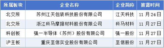 11月24日至11月30日期间,苏州江天包装科技股份有限公司、浙江科马摩擦材料股份有限公司、强一半导体(苏州)股份有限公司、重庆至信实业股份有限公司取得了注册批文。