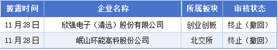11月24日至11月30日期间,欣强电子(清远)股份有限公司、岷山环能高科股份公司终止(撤回)了IPO。