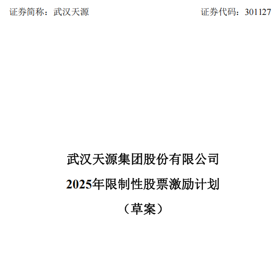2025年12月2日,武汉天源(股票代码:301127)发布《2025年限制性股票激励计划(草案)》,拟向151名核心骨干授予1,088万股第一类限制性股票,占公司总股本的1.61%,授予价格定为7.52元/股。