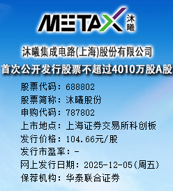 中国上市公司网讯 12月5日,沐曦集成电路(上海)股份有限公司(以下简称“沐曦股份”或公司)申购。公司的股票简称为“沐曦股份”,扩位简称为“沐曦股份”,股票代码为“688802”,该代码同时用于本次发行的初步询价及网下申购,本次发行网上申购代码为“787802”。沐曦股份本次发行价格为104.66元/股。