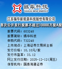 中国上市公司网讯 12月12日,江苏锡华新能源科技股份有限公司(以下简称“锡华科技”或公司)申购。公司的股票简称为“锡华科技”,扩位简称为“锡华科技”,股票代码为“603248”,该代码同时用于本次发行的初步询价及网下申购,本次发行网上申购代码为“732248”。锡华科技本次发行价格为10.10元/股,发行市盈率为33.12倍。