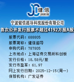 中国上市公司网讯 12月15日,宁波健信超导科技股份有限公司(以下简称“健信超导”或公司)申购。公司的股票简称为“健信超导”,扩位简称为“健信超导”,股票代码为“688805”,该代码同时用于本次发行的初步询价及网下申购,本次发行网上申购代码为“787805”。健信超导本次发行价格为18.58元/股,发行市盈率为61.97倍。