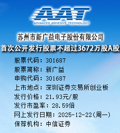 中国上市公司网讯 12月22日,苏州市新广益电子股份有限公司(以下简称“新广益”或公司)申购。公司的股票简称为“新广益”,股票代码为“301687”,该简称和代码同时用于本次发行的网上发行及网下发行。新广益本次发行价格为21.93元/股,发行市盈率为28.59倍。