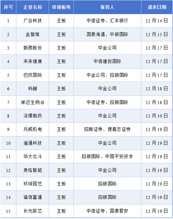 12月14日至12月20日期间广合科技、金智维、新奥股份、未来健康、巴奴国际、科郦、岸迈生物-B、泽璟制药、兆威机电、道通科技、美格智能、环球园艺、福信富通、长光辰芯向港交所递交上市申请,其中广合科技、新奥股份、泽璟制药、兆威机电、道通科技、美格智能已登陆A股,此次冲击“A+H”两地上市。