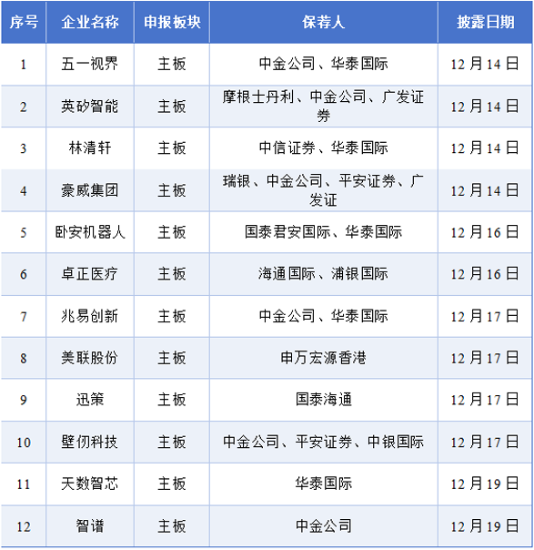 12月14日至12月20日期间,五一视界、英矽智能、林清轩、豪威集团、卧安机器人、卓正医疗、兆易创新、美联股份、迅策、壁仞科技、天数智芯、智谱共12家公司通过聆讯。