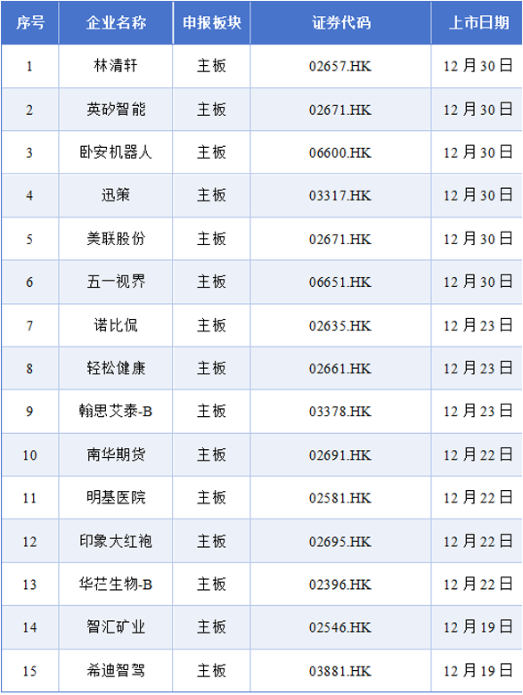 12月14日至12月20日间,林清轩、英矽智能、卧安机器人、迅策、美联股份、五一视界、诺比侃、轻松健康、翰思艾泰-B、南华期货、明基医院、印象大红袍、华芢生物-B、智汇矿业、希迪智驾启动招股程序,其中,南华期货、明基医院、印象大红袍、华芢生物-B、智汇矿业、希迪智驾已完成招股。