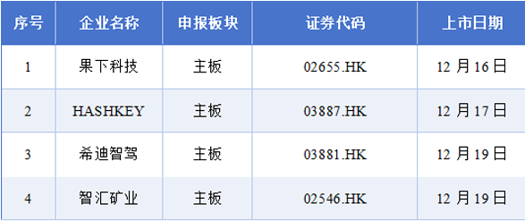 12月14日至12月20日期间,果下科技、HASHKEY、希迪智驾、卓智汇矿业挂牌上市。