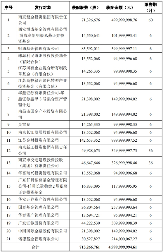 据公开资料显示,南京证券本次发行对象最终确定为21家。本次向特定对象发行股票完成后:紫金集团认购的本次发行的股份自本次发行结束之日起60个月内不得转让;其他持有公司股份比例5%以上(含5%)的发行对象新工集团、交通集团认购的本次发行的股份,自本次发行结束之日起36个月内不得转让;持有公司股份比例5%以下的发行对象认购的本次发行的股份,自本次发行结束之日起6个月内不得转让。公司本次发行募集资金总额4,999,999,994.61元,募集资金净额为4,897,339,385.03元。