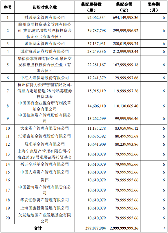 据公开资料显示,安迪苏本次发行对象最终确定为20家。本次发行完成后,发行对象所认购的本次向特定对象发行的股票自发行结束之日起6个月内不得转让。公司本次发行募集资金总额2,999,999,999.36元,募集资金净额为2,983,875,106.46元。