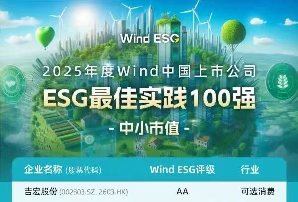 国内权威ESG评级机构 Wind ESG重磅发布了“2025年度Wind中国上市公司ESG最佳实践100强”榜单,吉宏股份从众多上市公司中脱颖而出,荣登“2025年度Wind中国上市公司ESG最佳实践100强(中小市值)”榜单!