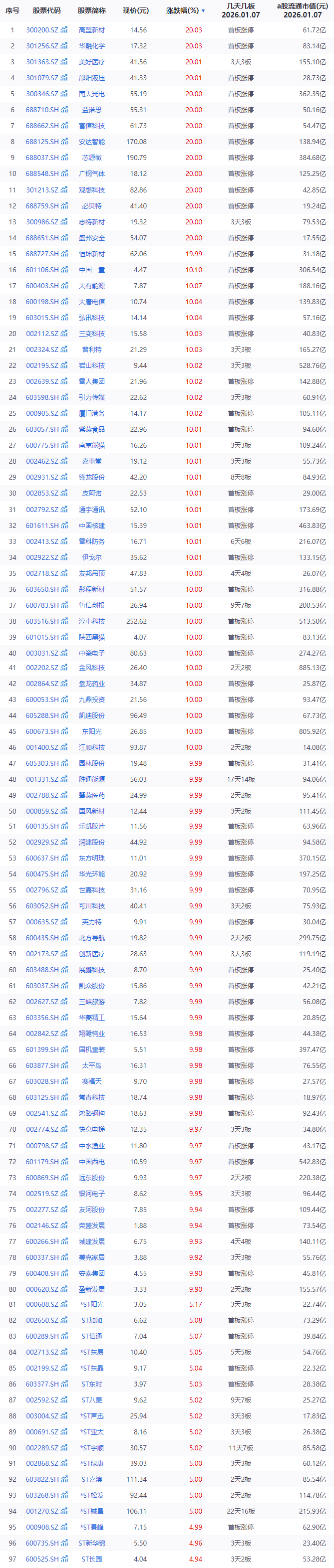 今日涨停个股