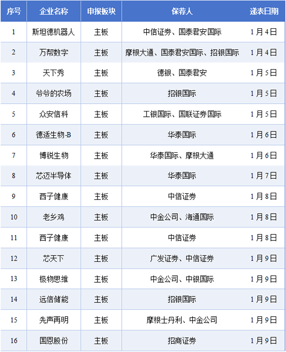 1月4日至1月10日期间斯坦德机器人、万帮数字、天下秀、爷爷的农场、众安信科、德适生物-B、博锐生物、芯迈半导体、西子健康、芯天下、极物思维、远信储能、先声再明、国恩股份向港交所递交上市申请,其中天下秀、国恩股份已登陆A股,此次冲击“A+H”两地上市。