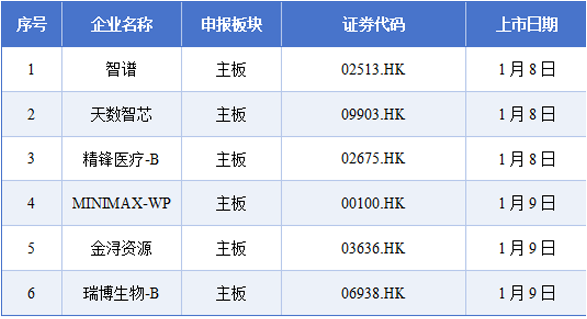 1月4日至1月10日期间,智谱、天数智芯、精锋医疗-B、MINIMAX-WP、金浔资源、瑞博生物-B挂牌上市。