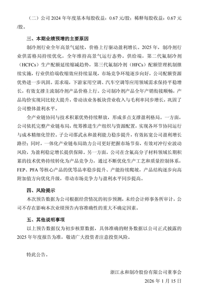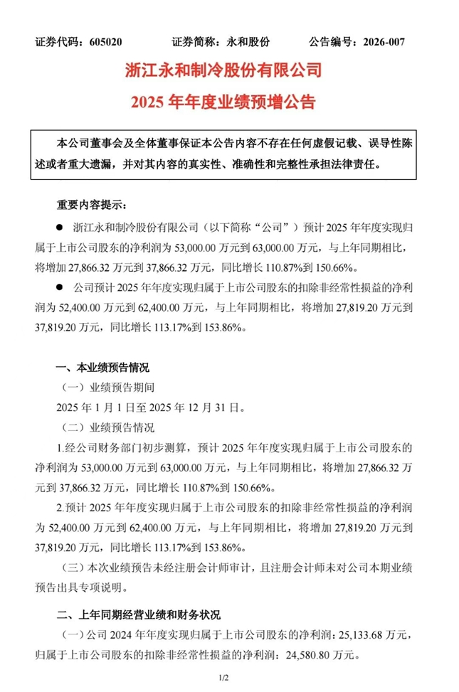 预增公告:永和股份2025年净利润预增110.87%到150.66%