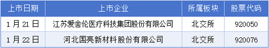 1月19日至1月25日期间,江苏爱舍伦医疗科技集团股份有限公司、河北国亮新材料股份有限公司挂牌上市。