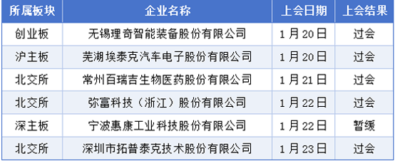 1月19日至1月25日期间,无锡理奇智能装备股份有限公司、芜湖埃泰克汽车电子股份有限公司、常州百瑞吉生物医药股份有限公司、弥富科技(浙江)股份有限公司、深圳市拓普泰克技术股份有限公司成功通过了审核流程;宁波惠康工业科技股份有限公司暂缓审议。