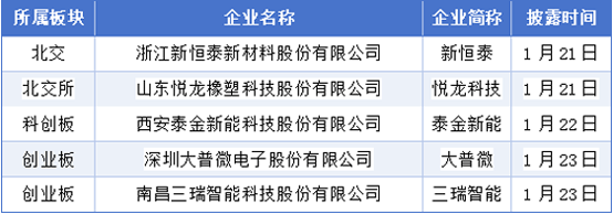 1月19日至1月25日期间,浙江新恒泰新材料股份有限公司、山东悦龙橡塑科技股份有限公司、西安泰金新能科技股份有限公司、深圳大普微电子股份有限公司、南昌三瑞智能科技股份有限公司取得了注册批文。
