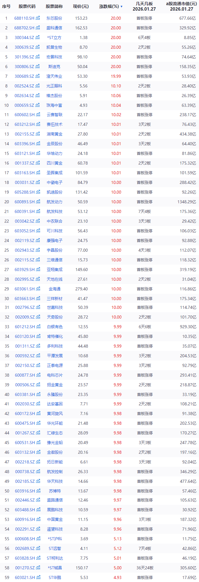 今日涨停个股