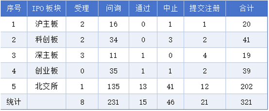 截至2月1日,IPO排队企业321家,其中沪主板排队企业20家,科创板排队企业41家,深主板排队企业19家,创业板排队企业39家,北交所排队企业202家。