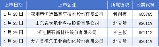 1月26日至2月1日期间,深圳市恒运昌真空技术股份有限公司、山东农大肥业科技股份有限公司、浙江振石新材料股份有限公司、大连美德乐工业自动化股份有限公司挂牌上市。