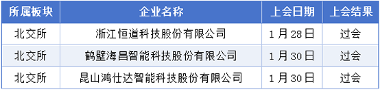 1月26日至2月1日期间,浙江恒道科技股份有限公司、鹤壁海昌智能科技股份有限公司、昆山鸿仕达智能科技股份有限公司成功通过了审核流程。